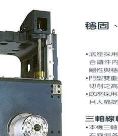 穩定性優異,三軸行程無懸垂現象,荷重力佳,工件移動平穩,結合門型雙重壁立柱(機身)剛性結構,確