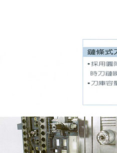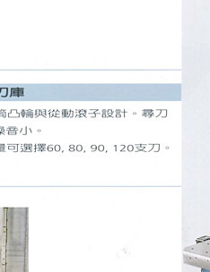 • 刀庫傳動結構:使用圓筒凸輪與從動滾子之設計可取代舊式油壓馬達的方式,優點:於尋刀時刀鏈較無噪音