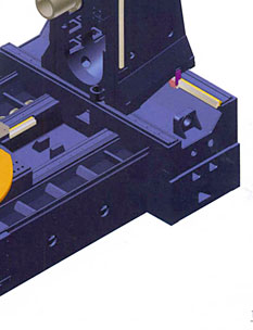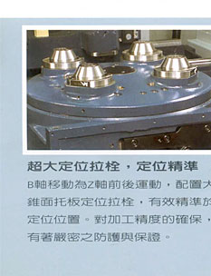 •B軸移動為Z軸前後運動,配置大錐面托板定位栓,有效精準於定位位置。對加工精度的確保,有著嚴密之