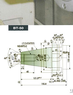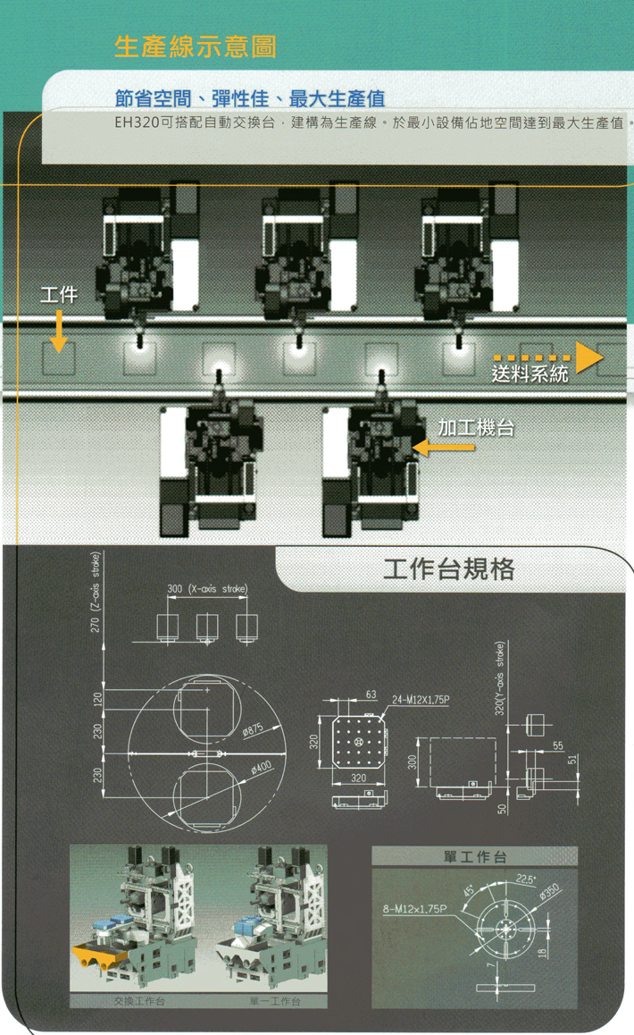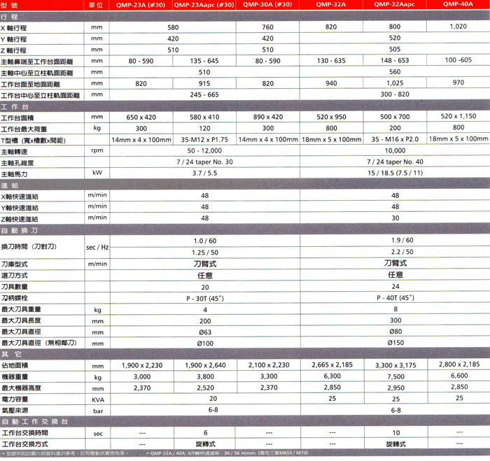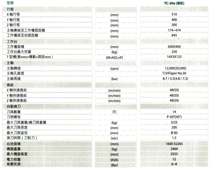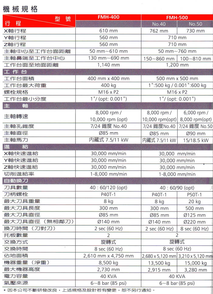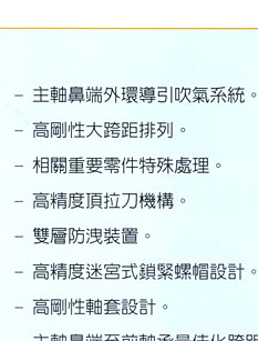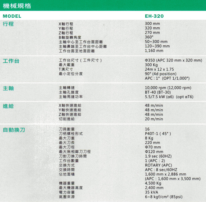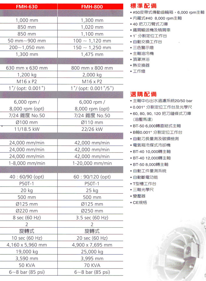 •主軸中心出水、皮帶式主軸/40W#、自動刀具長度測量、光學尺、T型槽工作台、5°分割定位工作台、刀柄螺栓