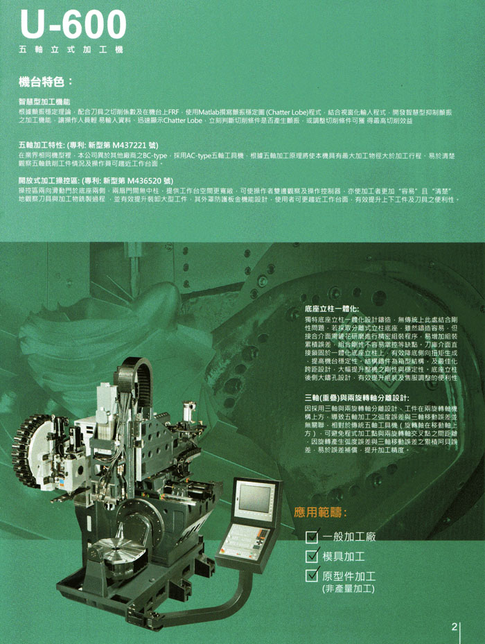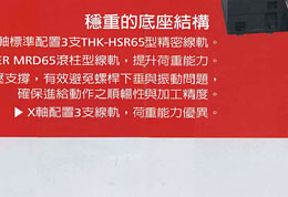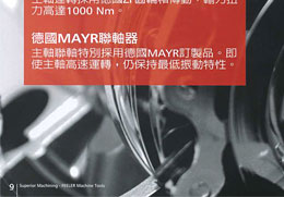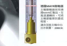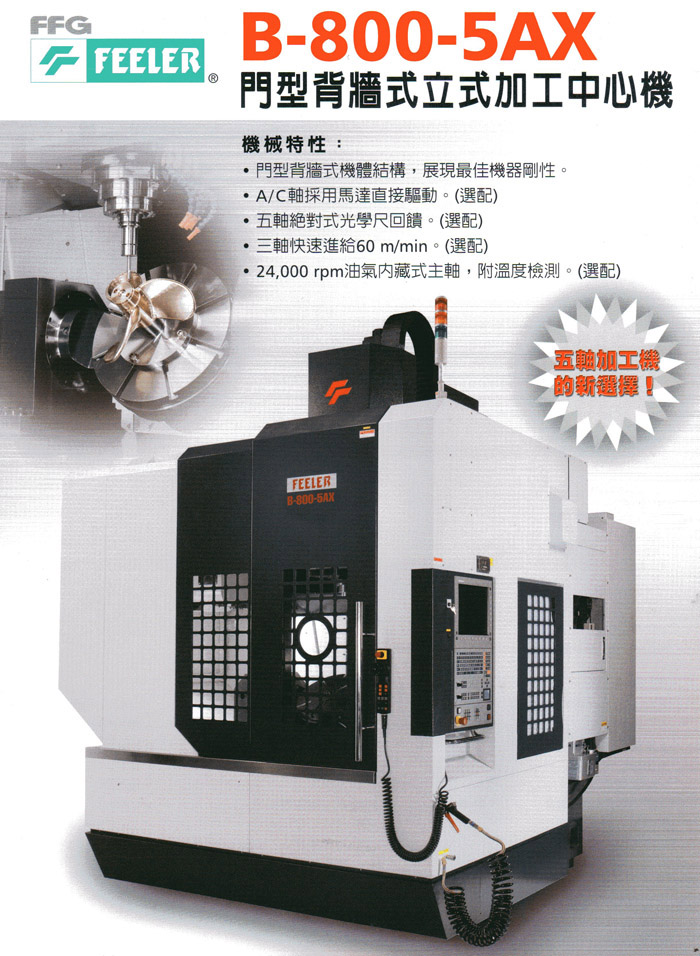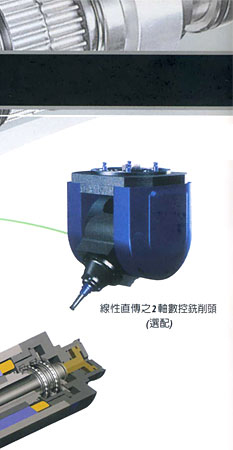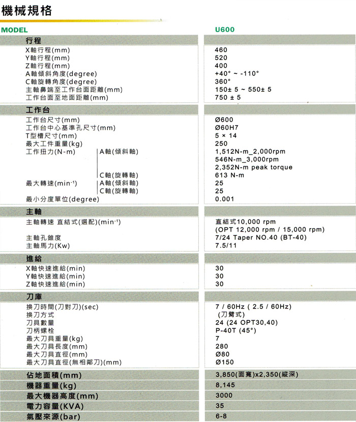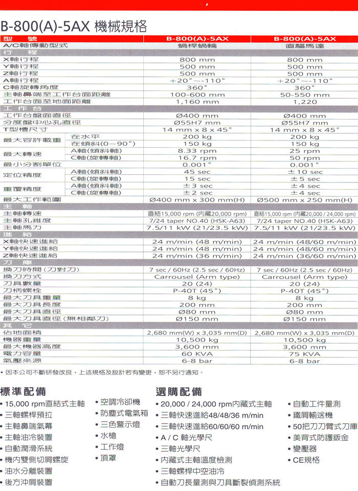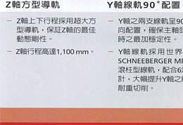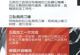 •90把刀自動交換系統、自動刀具量測系統、工件定中心座標尺寸量測系統、切削液主軸中心出水系統 (立式主軸)、上防濺護罩、光學尺